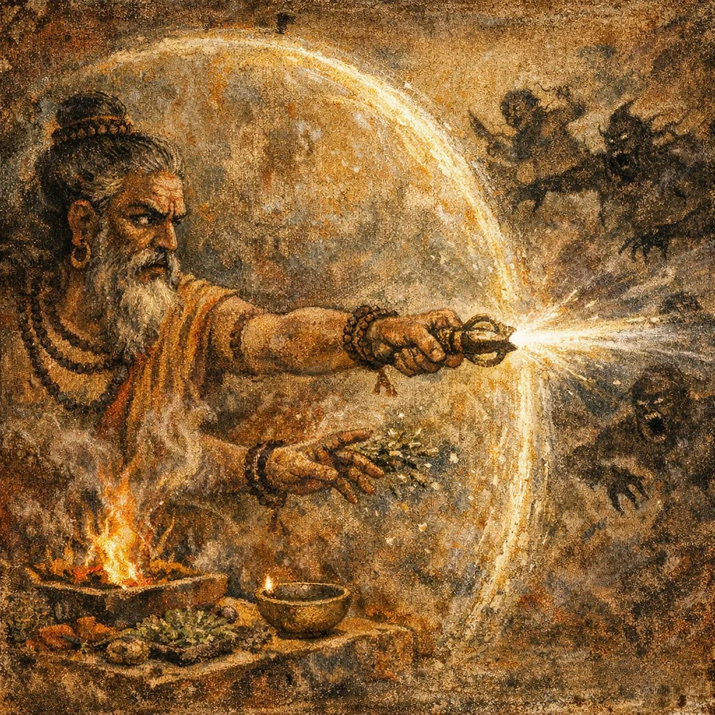 In Atharvanic terms it is abhicāra with a defensive aim: it targets hostile aggressors who are advancing, seeking to prevent harm by disabling and routing them under Indra’s power.