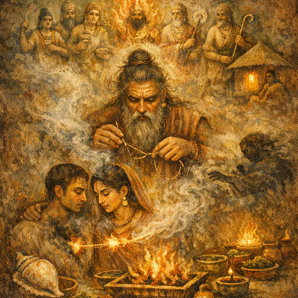 The hymn frames the offering as a real binding operation: the reciter ‘stitches together’ the group’s inner impulses and intentions through havis and ghee, turning heated impulses into shared harmony.