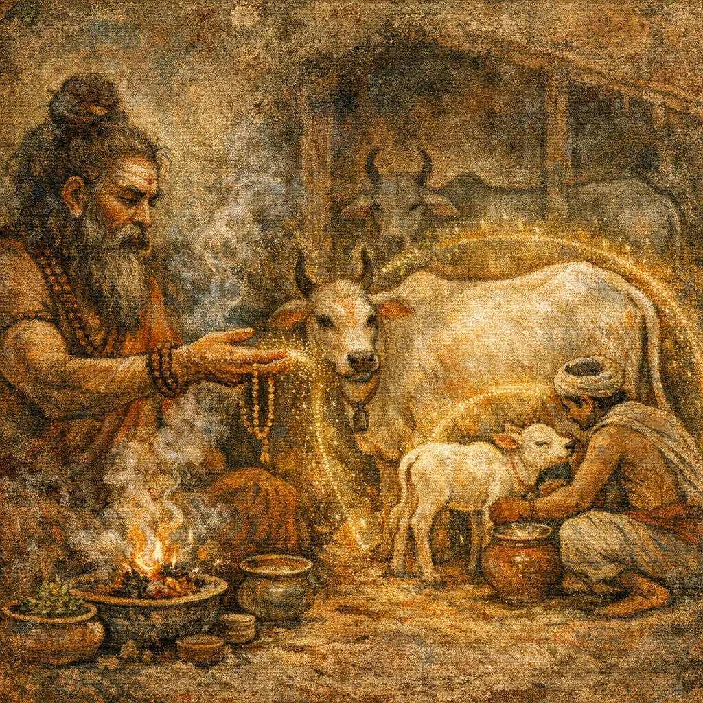 It can be recited at the byre or at milking time, optionally with a small offering of milk or ghee, focusing intention on sustained cattle productivity and the ordering of one’s bodily well-being.