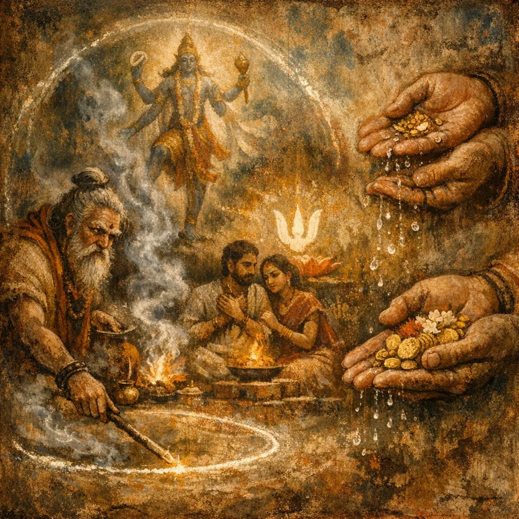 In this sukta, prosperity is not just ‘gain’ but stable order: when Viṣṇu’s strides secure space and drive off impediments, wealth can legitimately flow in from all regions and ‘fill the hands’ of the patron.