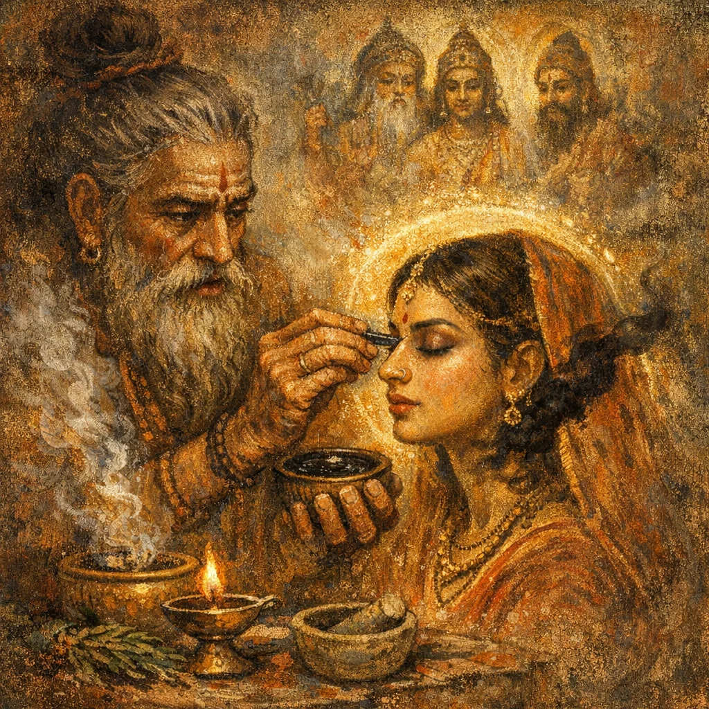 Recite the verse over the collyrium as a consecration, then apply a small amount with a clean applicator. Traditionally it is done in the morning or whenever protection of sight is sought.