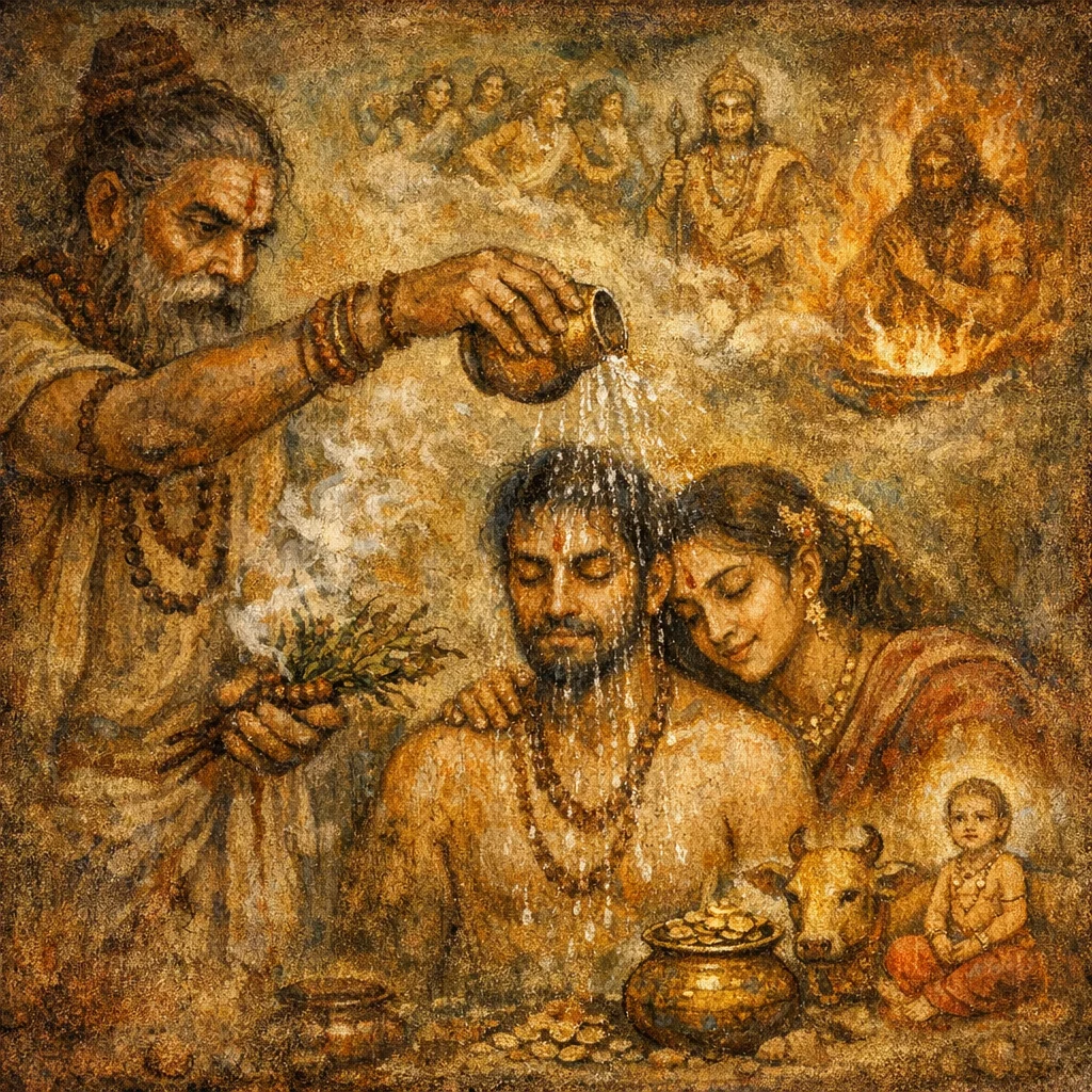 It is used for āyuṣya (longevity) and paustika (increase)—to bless a person with long life along with progeny and wealth through a consecratory sprinkling prayer.