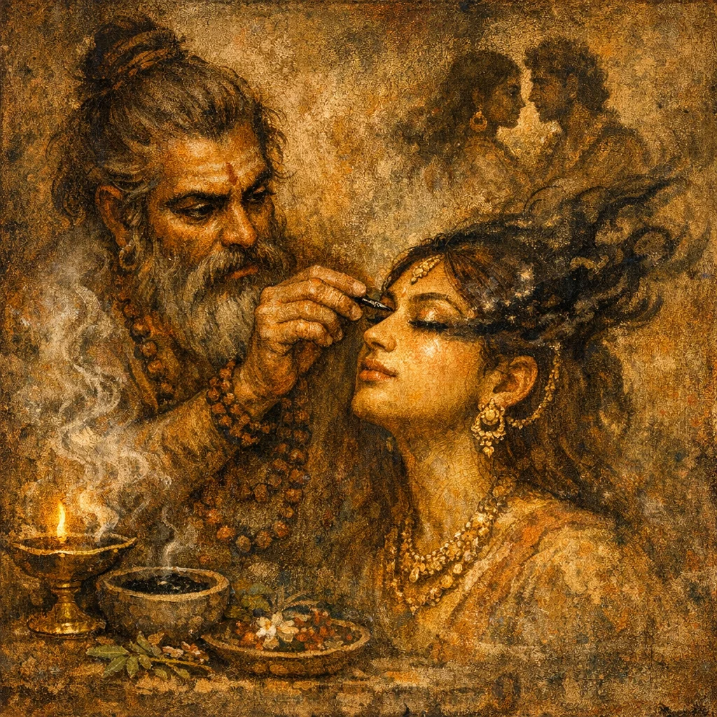 Recite the verse over the collyrium and apply it to both eyes with the intention of mutual harmony. The mantra’s core request is to be ‘within the heart’ of the other so that the two minds settle into concord.