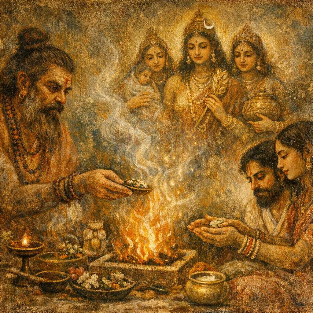The hymn asks for conception and the firm establishment of children (prajā), along with protection of childbirth and the broader prosperity of the household.
