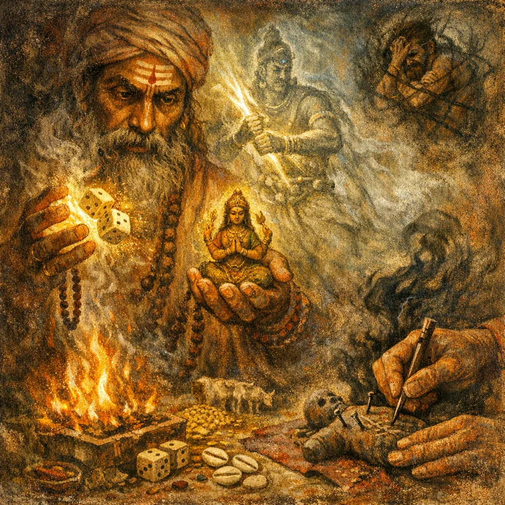 Bhaga represents one’s allotted fortune and share. Calling him “from every quarter” ritualizes the idea that luck, support, and advantage are gathered from all directions and consolidated into the patron’s hand.