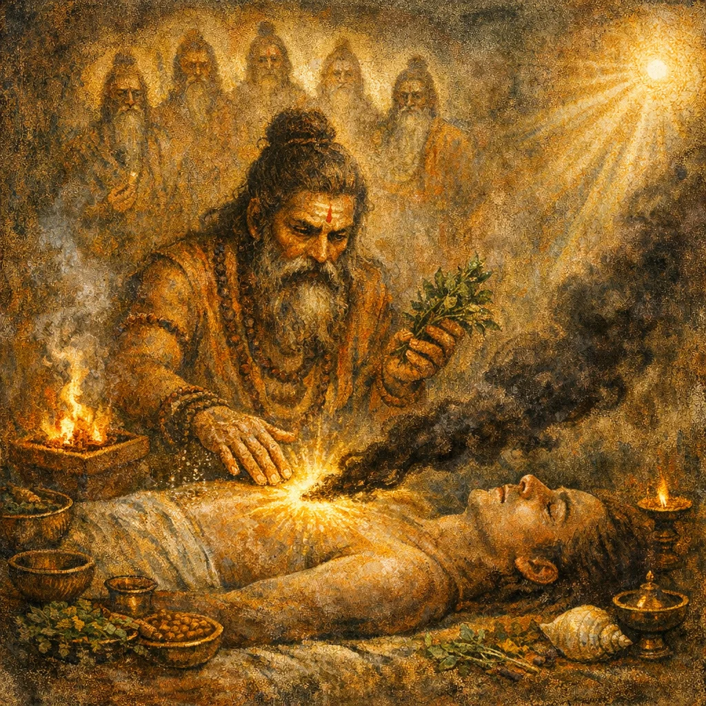 What life of thine is overlaid afar away, let out-breath and in-breath bring it back again hither. Agni hath fetched it from Nirṛti’s lap; that same I set again within thy self, and cause it to enter thee.