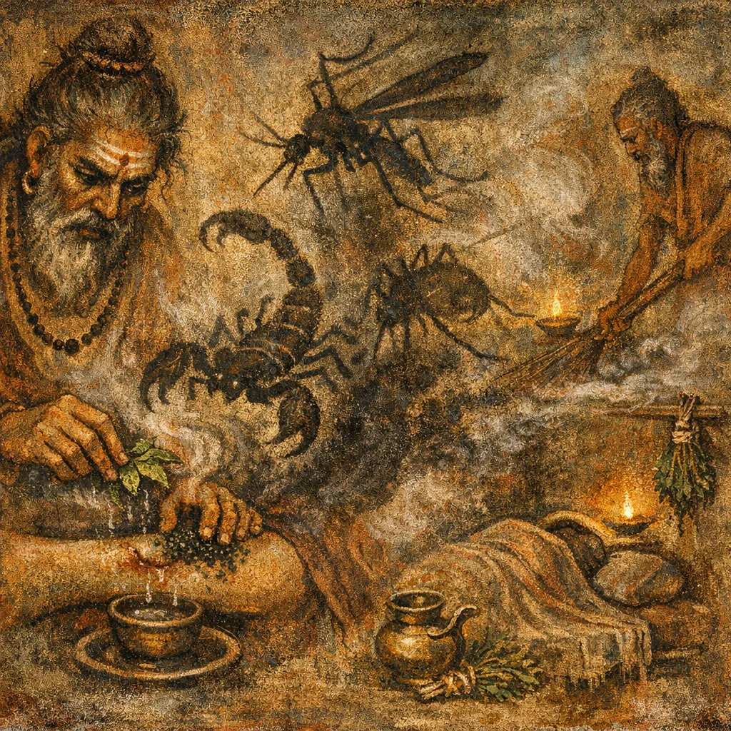 Whencesoever it was bitten, whencesoever it was lodged—thence we call it forth: the sapless poison of the tiny, sharp-biting mosquito.