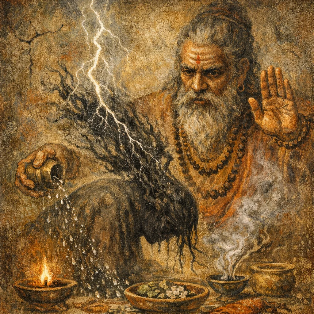 Devata: Śāpa (curse) as adversarial force; implicit divine sanction via ‘vidyut’ imagery.