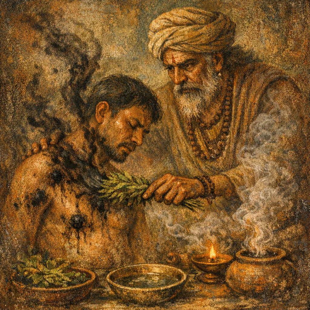 A practitioner recites the verses while sweeping or rubbing the patient lightly with Apāmārga, intending that curses and impurities are wiped off and driven away, then the used plant is discarded outside.
