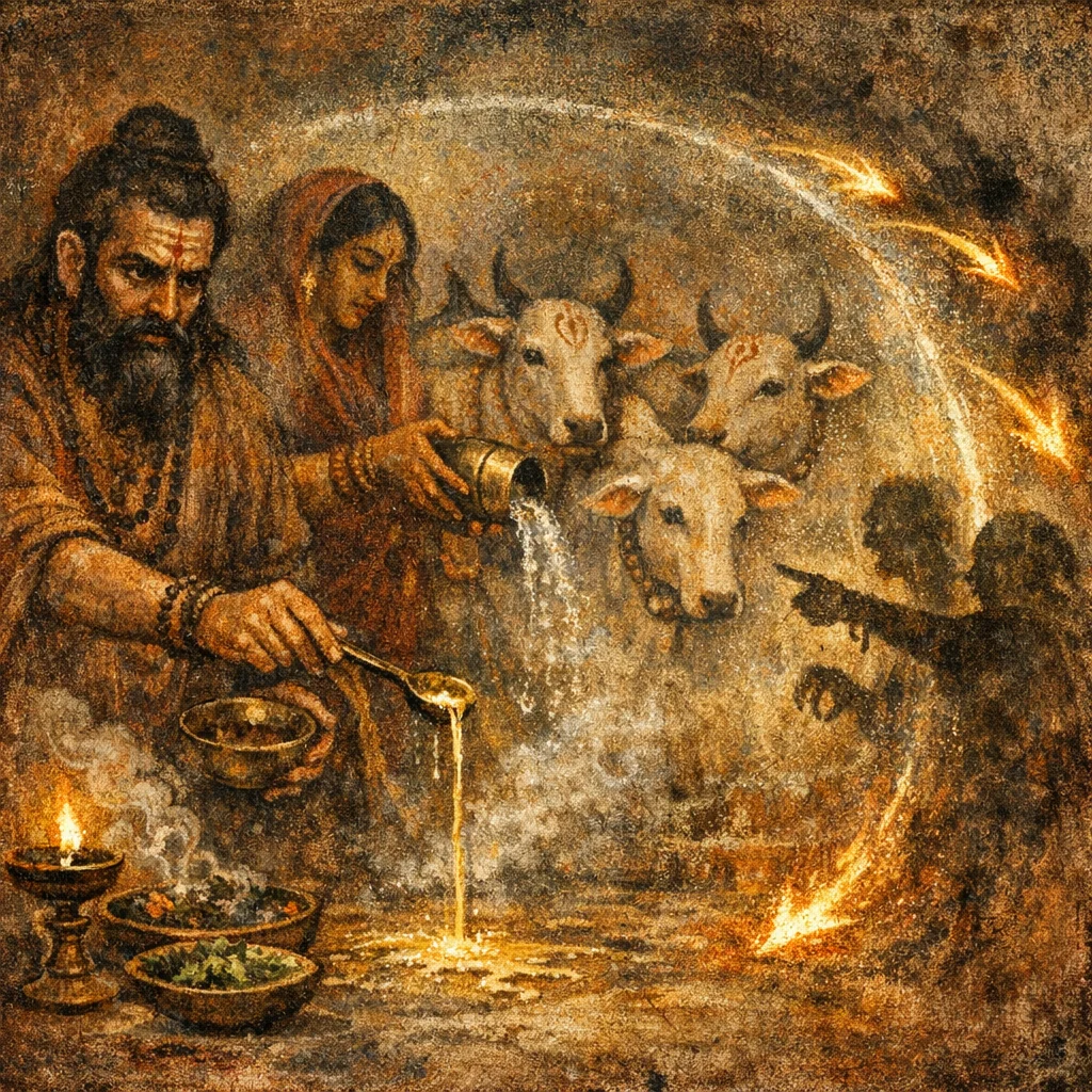 In this hymn Rudra’s fierce power is redirected into guardianship: his “heti” (weapon/missile) is asked to stand around the herd as a deterrent to thieves and hostile forces.