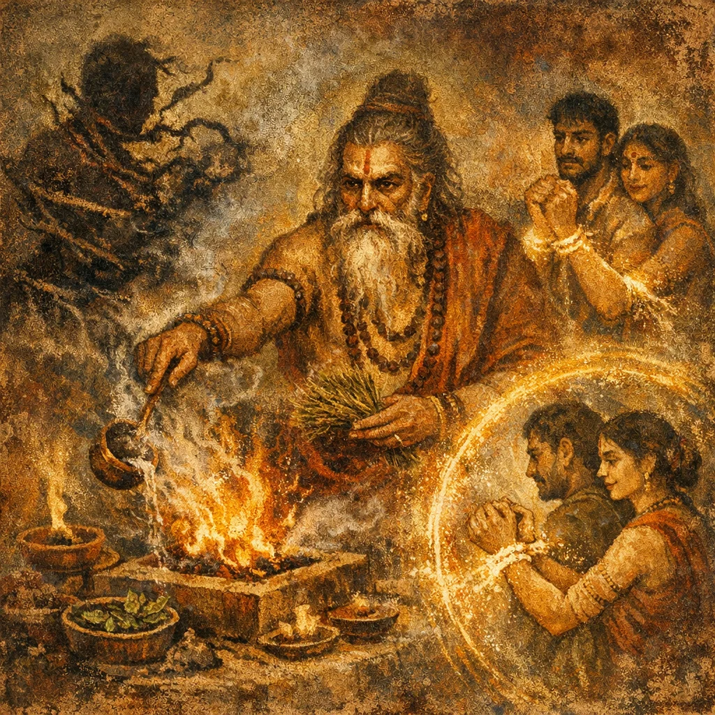 Rishi: Atharvanic tradition (exact r̥ṣi not specified in the provided excerpt; commonly assigned by Anukramaṇī to an Atharvan/Angiras line for such apotropaic material).