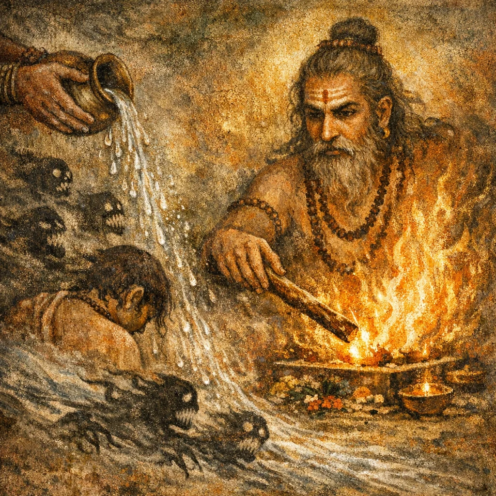 This sukta primarily works with water (for sprinkling) and the fire with fuel/kindling. Herbs and amulets are not required by the hymn’s wording; the key act is the recitation with water-purification and the tejas-transfer at the fire.
