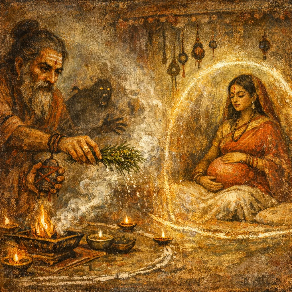 The nīvi functions as a protective, wearable boundary. Tying or wearing it during recitation embodies the hymn’s key idea: the embryo and well-being should be secured and not ‘fall away,’ while dangers are kept outside.
