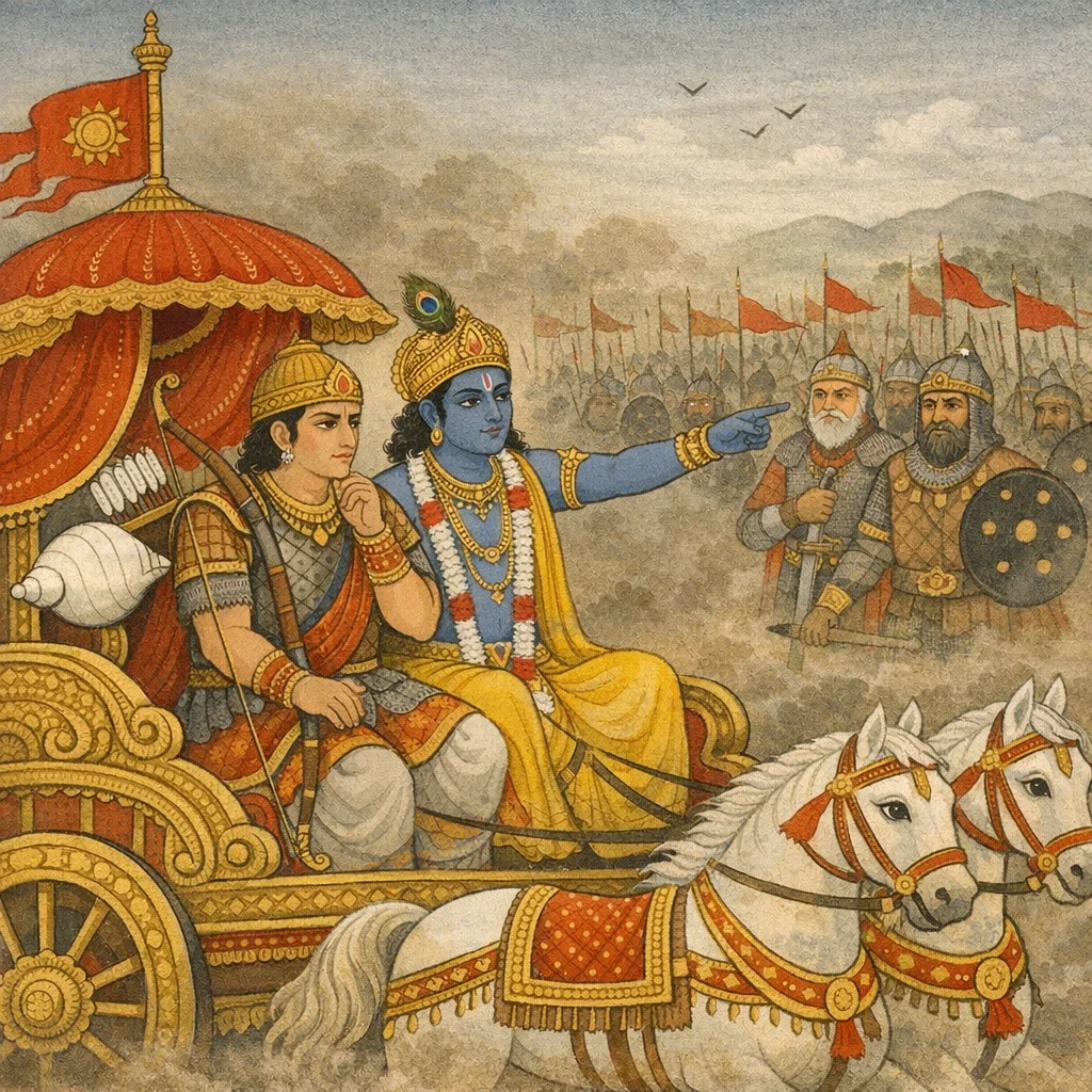 This is the immediate setup for Arjuna’s recognition of teachers and kin, catalyzing his crisis (viṣāda).