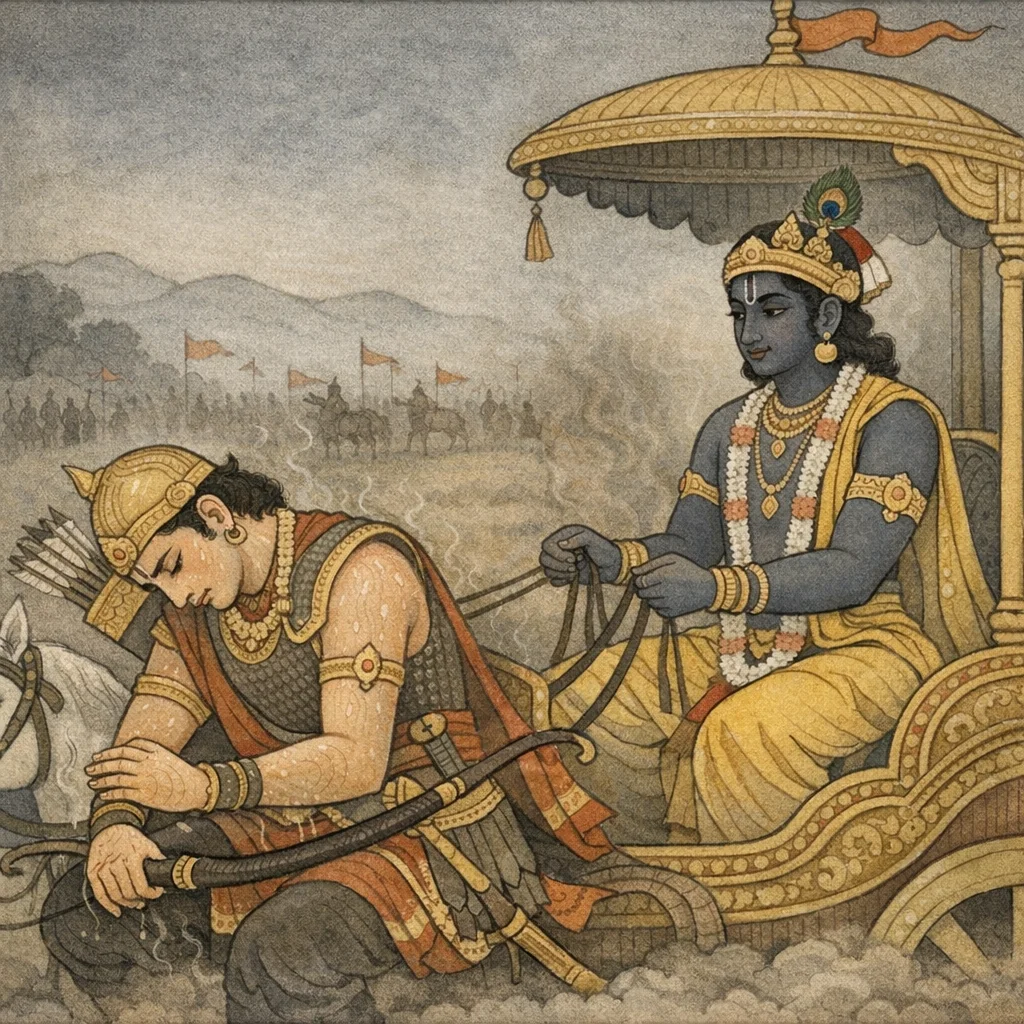 These symptoms intensify the narrative of Arjuna’s collapse into despondency, preparing for his explicit refusal to proceed.