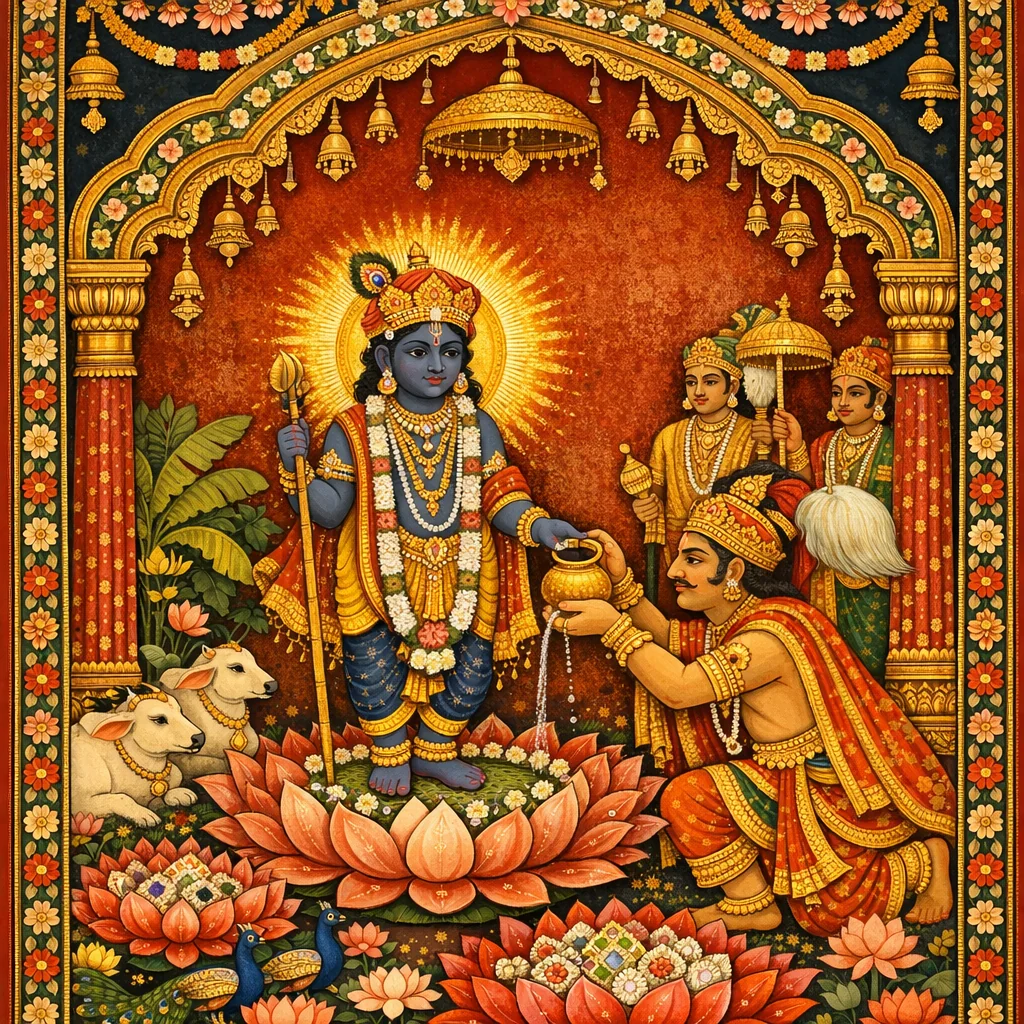 Bound by the Lord with affectionate favor, Bali was then installed in Sutala, a realm more opulent than the heavens. There Bali Mahārāja now dwells like a sovereign, more comfortably situated than Indra.