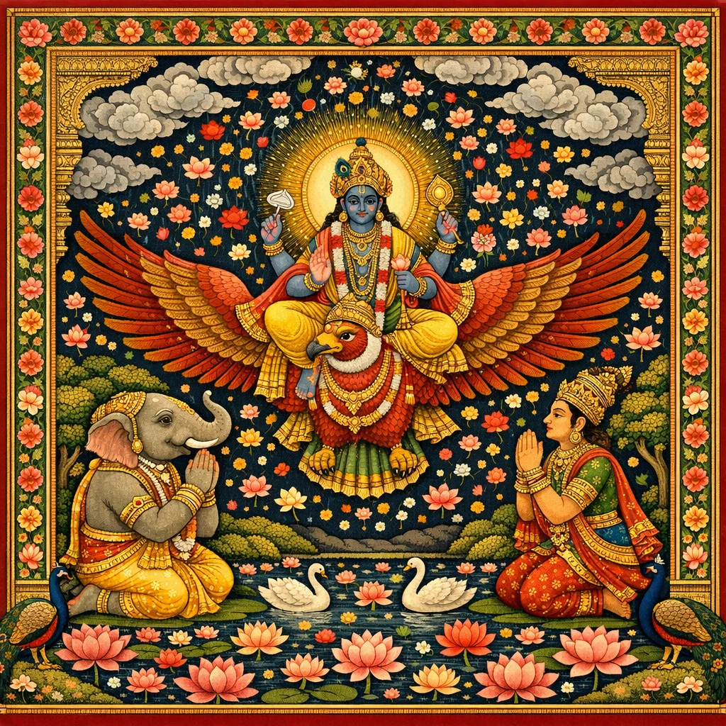 Having delivered the king of elephants from the crocodile’s grip—and from the crocodile-like snare of material existence—the lotus-naveled Lord granted him sārūpya-mukti and the status of an eternal attendant. As Gandharvas, Siddhas, and the devas sang of His wondrous deeds, the Lord, seated upon Garuḍa, returned to His marvelous abode, taking Gajendra with Him.