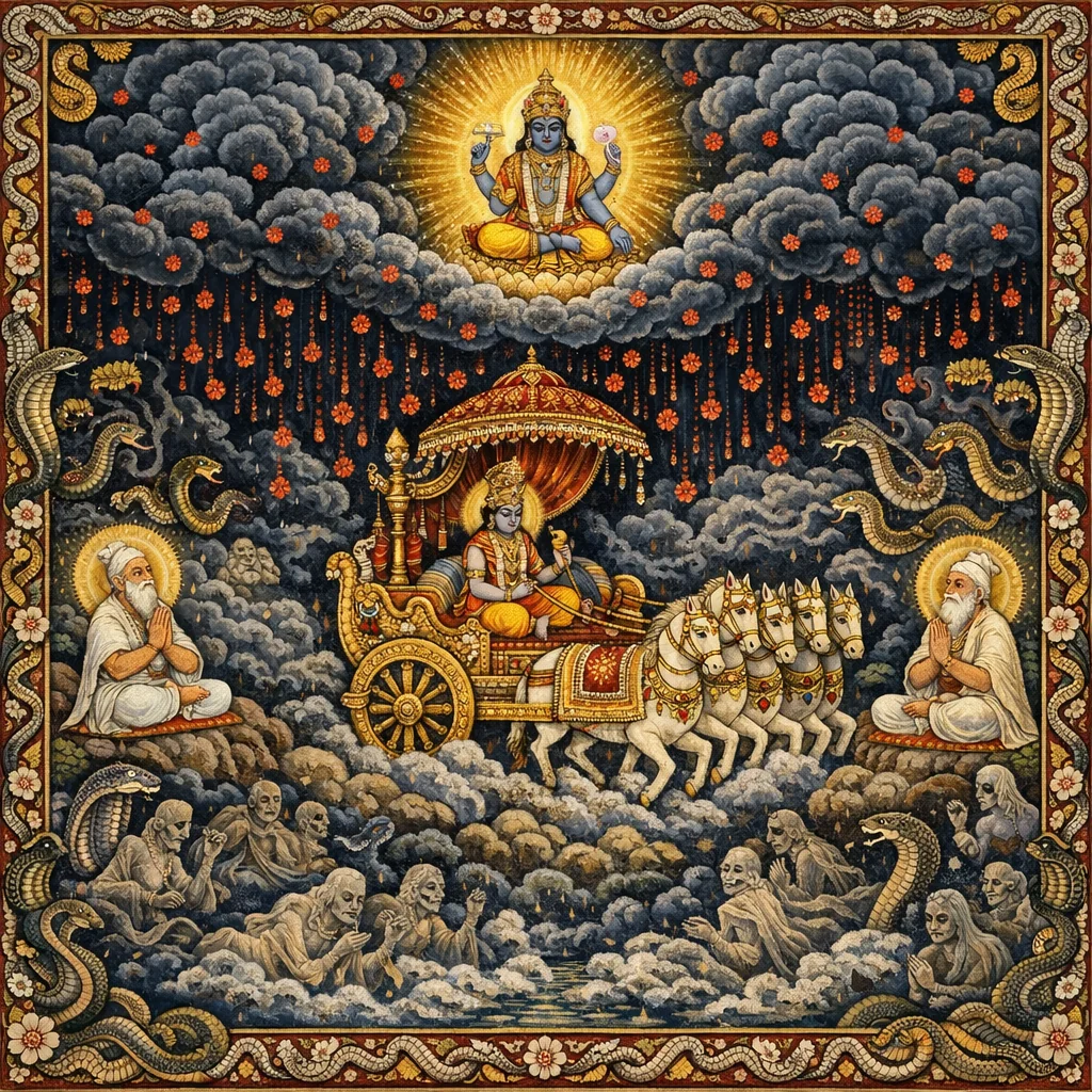 When direct combat fails, the Yakṣas project terrifying illusory phenomena: dust storms, thunderclouds, unnatural rainfall containing blood and impurities, falling body parts, hail and weapons from the sky, fire-breathing serpents, predatory beasts, and an ocean-like deluge resembling cosmic dissolution. The purpose is to destabilize Dhruva’s mind and frighten a less intelligent opponent, showing māyā as a weapon that targets perception and courage.