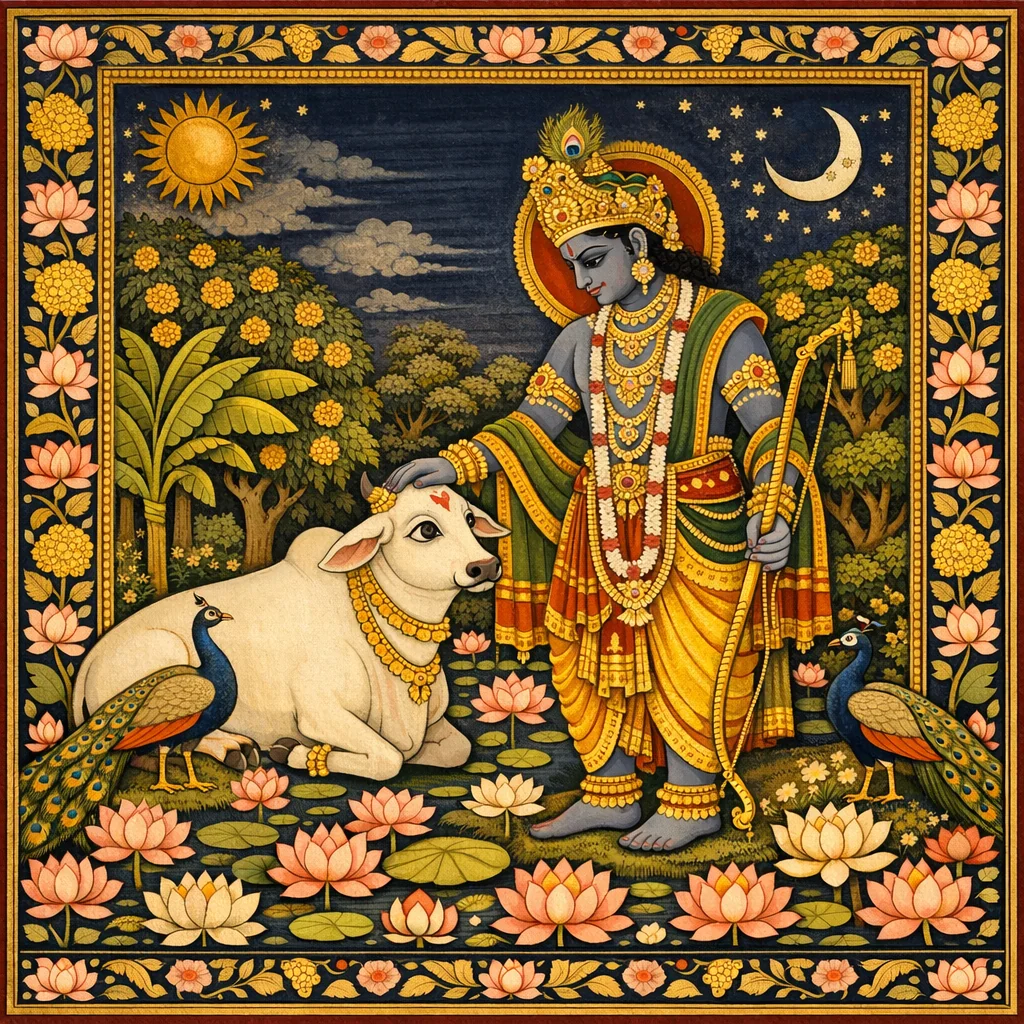 The cow-form communicates that nature is meant to nourish when approached through dharma: like a cow gives milk when properly cared for and milked with the right method, Bhūmi yields grains and prosperity when governance is righteous and yajña-based reciprocity is honored. The imagery also frames the king’s role: not exploitation, but disciplined stewardship that converts latent abundance into sustenance for all beings.