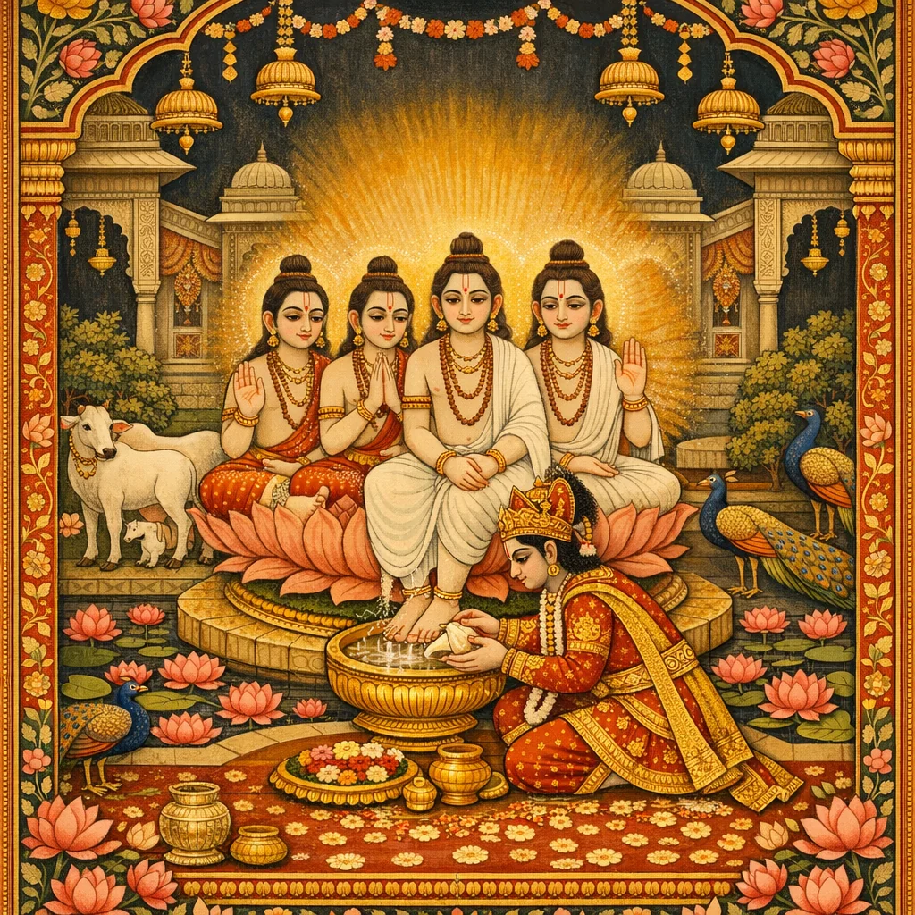 Thereafter the King took the water that had washed the Kumāras’ lotus feet and sprinkled it upon his hair. By such reverent conduct, he set the example of how to honor and receive a spiritually exalted saint.