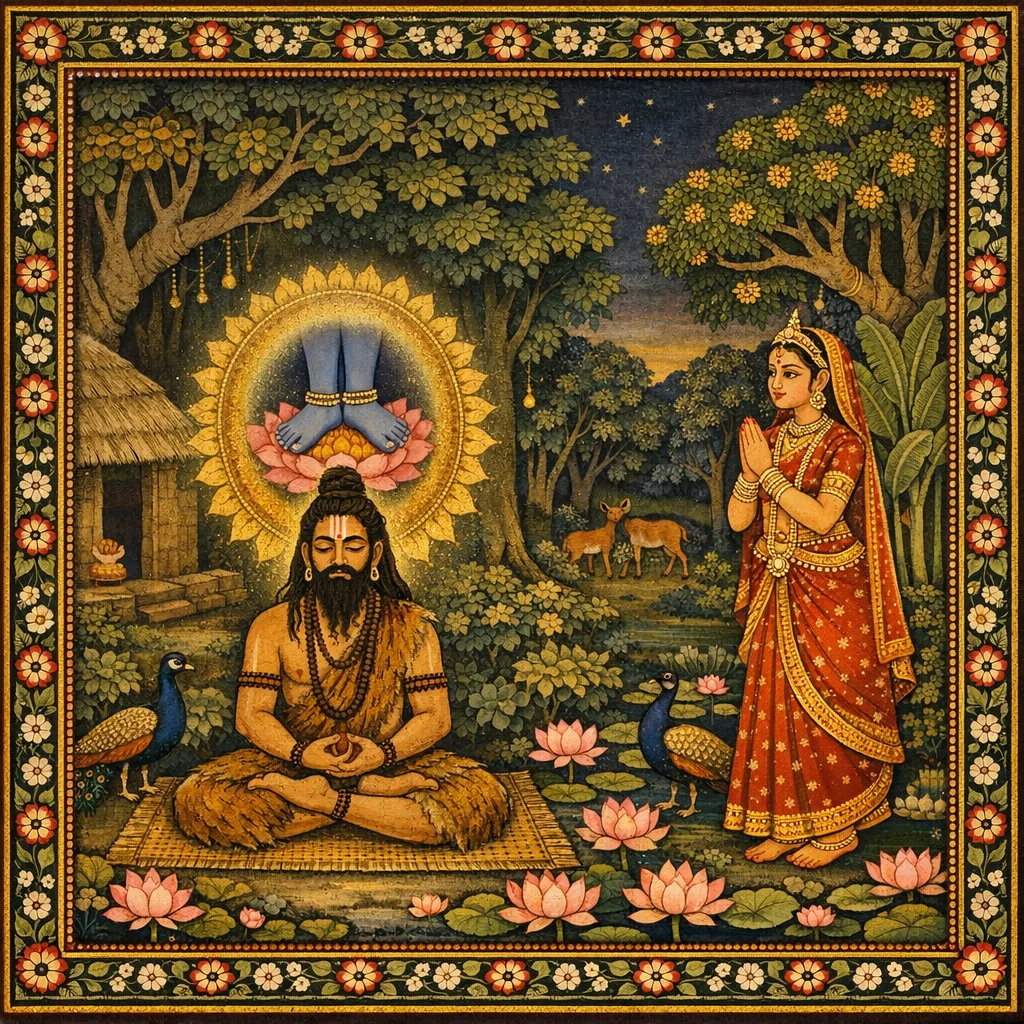 Though unaccustomed to such hardship, Queen Arci faithfully followed her husband’s vows, living in the forest like the great sages. She slept on the ground and ate only fruits, flowers, and leaves, growing frail and thin; yet the joy of serving her beloved husband made her feel no distress.