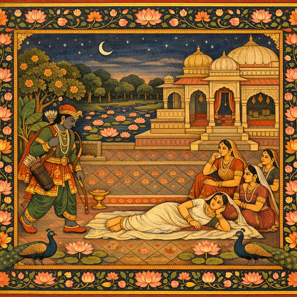 Having eaten and become satisfied, King Purañjana felt joy and a touch of pride. Rather than rising to higher consciousness, his mind was drawn by Kandarpa (Cupid), and he longed to find his wife, who sustained his contentment in household life.
