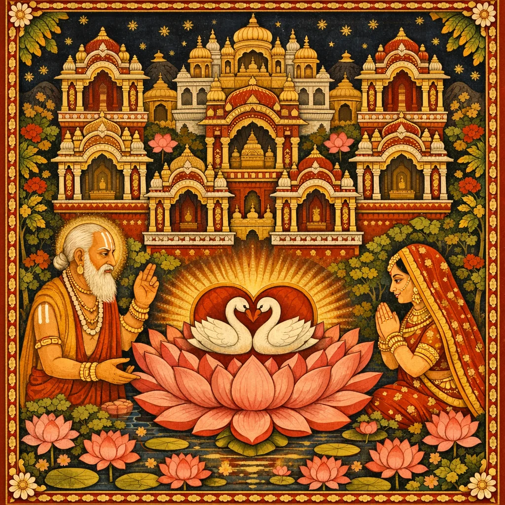 My gentle friend, you and I are like two swans, dwelling together in the same lake of the heart, like Mānasa. Yet for many thousands of years we have remained far from our original home.