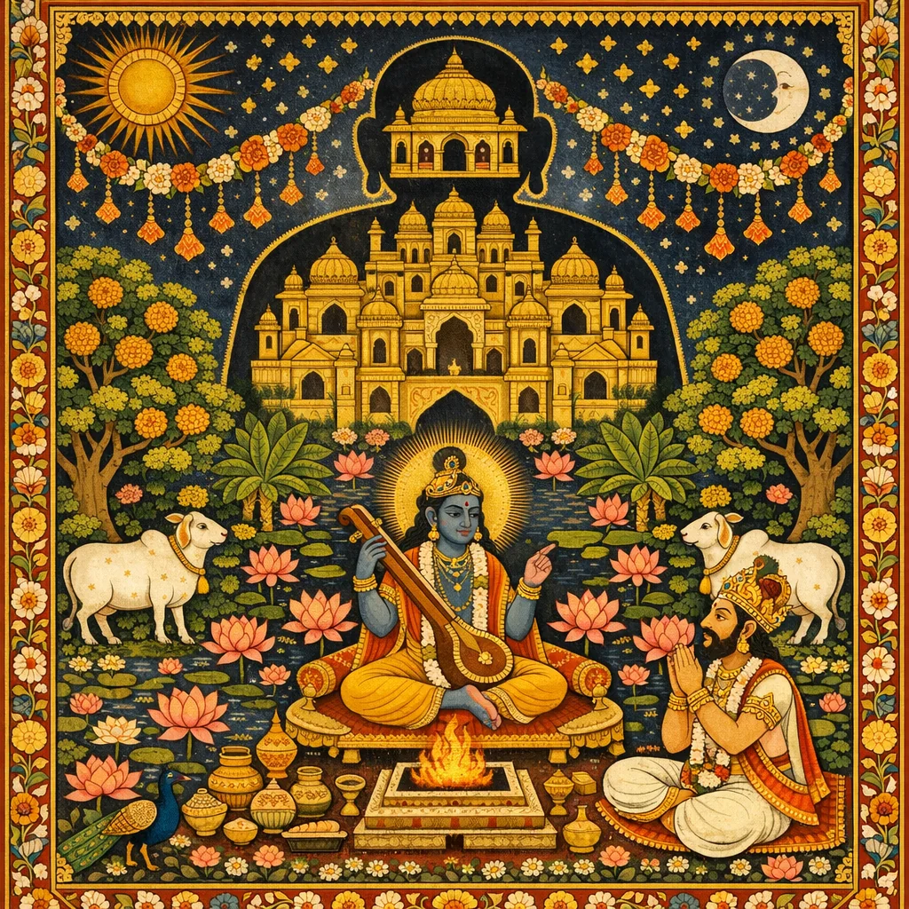 Seeing King Prācīnabarhi unable to grasp the Purañjana allegory, Nārada methodically decodes it as a map of embodied life: the jīva is Purañjana, the “unknown friend” is Bhagavān, and the human/deva body is the nine-gated city where the senses, mind (manaḥ), prāṇas, and intelligence (buddhi) cooperate in enjoyment and suffering. He matches each “gate” with its sensory function and object, then extends the teaching into a chariot image—body as chariot, intelligence as driver, mind as the binding rope. Time (Caṇḍavega) wears down lifespan through day and night, and old age (Kālakanyā/Jarā) allies with death. Nārada rebukes pride in karma-kāṇḍa, showing that merely rearranging activities cannot undo karma; only awakening in Kṛṣṇa consciousness—especially through hearing and associating with devotees—ends the dream of saṁsāra. Prācīnabarhi accepts the correction, asks about karmic continuity across bodies, and Nārada explains transmigration of the subtle body through mind, impressions, and desire. The chapter ends with the king’s renunciation and liberation, and a phala-śruti promising freedom from bodily identification for attentive hearers, moving from allegory to lived transformation.