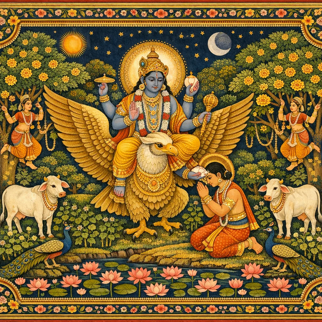 After reassuring the demigods, Lord Viṣṇu rides Garuḍa to Madhuvana to meet Dhruva. Dhruva’s meditation reaches its climax when his inner vision suddenly stops and the Lord appears before him. Overwhelmed, Dhruva is first speechless, but when the Lord touches his forehead with the conchshell, firm Vedic realization awakens and he offers powerful prayers. He glorifies the Lord’s energies, His presence as Paramātmā, and His cosmic functions, then reproaches his own material ambition, exalting bhakti above brahmānanda and even svarga. Above all he begs for sādhu-saṅga, knowing devotion alone carries one across saṁsāra. The Lord grants him the imperishable Dhruva-loka (the polestar) and foretells his future—rule, sacrifices, family tragedies, and final ascent to the Lord’s abode. After the Lord departs, Dhruva returns home ashamed of his earlier aims. Vidura asks why he is not pleased; Maitreya explains Dhruva’s remorse as the bhakta’s purification. The chapter then moves into Dhruva’s royal reception and Uttānapāda’s enthronement of him, preparing the next phase of righteous governance born of realized devotion and the elder king’s eventual renunciation.