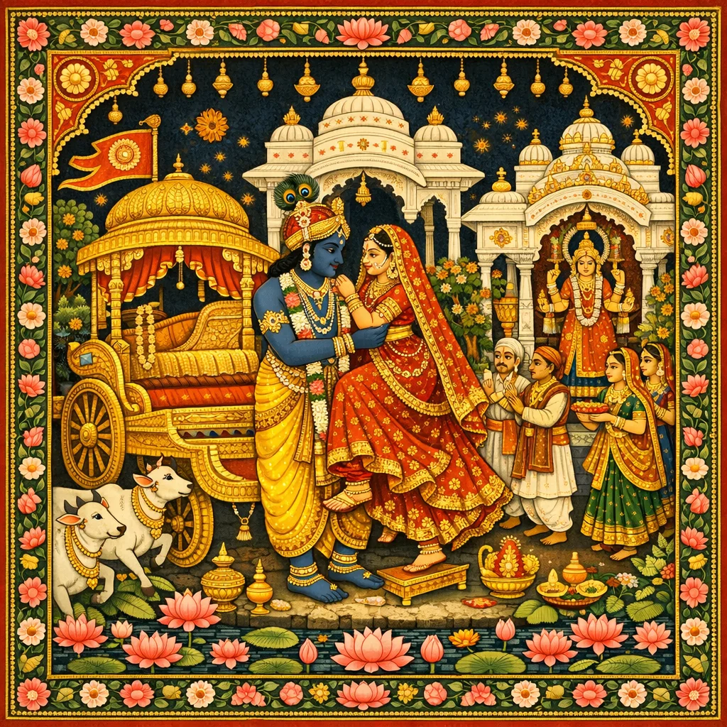 Within the Purāṇic-kṣatriya framework, this resembles the rākṣasa form of marriage (forcible taking in the presence of rival kings), which is treated as culturally intelligible for warrior society. The Bhāgavata emphasizes not coercion of the bride but protection of her freely chosen surrender: Rukmiṇī explicitly selects Kṛṣṇa, sends a messenger, and prays for Him. Kṛṣṇa’s act counters adharma rooted in envy and political manipulation, while honoring her consent and exclusive devotion.