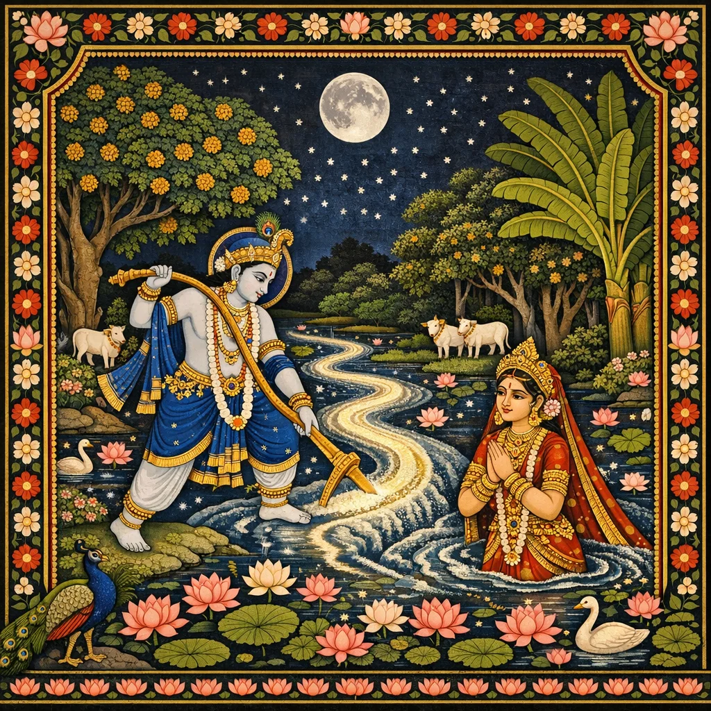 On the līlā level, Yamunā disregards His summons, and the Lord asserts His authority playfully yet decisively. Theologically, Halāyudha’s act reveals His divine potency over nature and sacred geography: the river’s channels become a visible, enduring marker of līlā. Yamunā’s surrender underscores the Purāṇic theme that even deities honor Bhagavān when His true position is recognized.