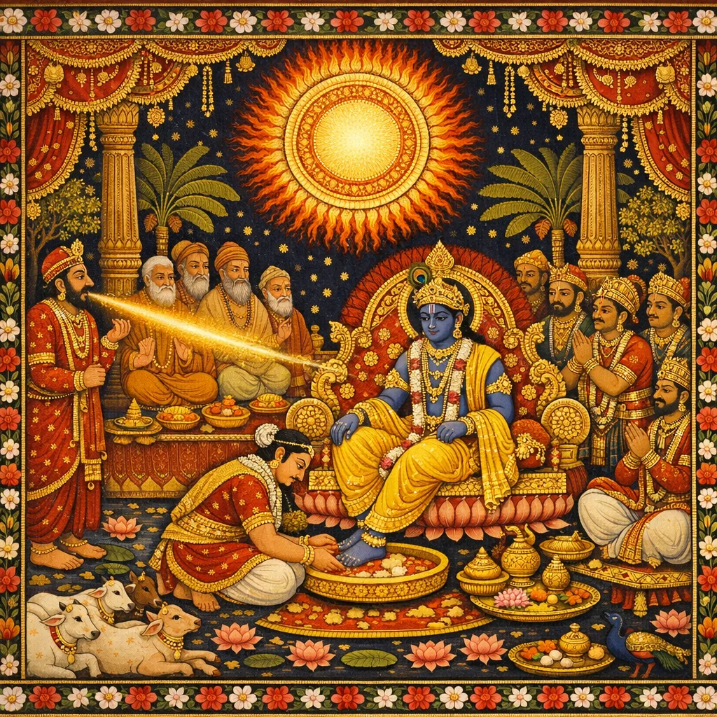 After defeating Jarāsandha and freeing the captive kings, Yudhiṣṭhira—delighting in Śrī Kṛṣṇa’s majesty—prepares the Rājasūya sacrifice with Kṛṣṇa’s consent, appointing eminent Vedic ṛtviks and welcoming rulers and beings from all realms. On the soma day the assembly debates who deserves agrapūjā (first worship), until Sahadeva resolves it by declaring Acyuta the very ontological foundation of yajña—its devas, mantras, time, place, and fruits—thus revealing sacrifice as ultimately God-centered. Yudhiṣṭhira worships Kṛṣṇa with tears and pāda-jala, and all acclaim Him. Śiśupāla, unable to bear Kṛṣṇa’s glorification, publicly blasphemes; devotees protest and warriors rise, but Kṛṣṇa restrains them and personally beheads Śiśupāla with the Sudarśana cakra. A radiant effulgence then enters Kṛṣṇa, showing that even hatred fixed upon the Lord can end in liberation through contact with His transcendence. The rite concludes with avabhṛtha; all depart satisfied except Duryodhana, whose envy foreshadows the next conflict.