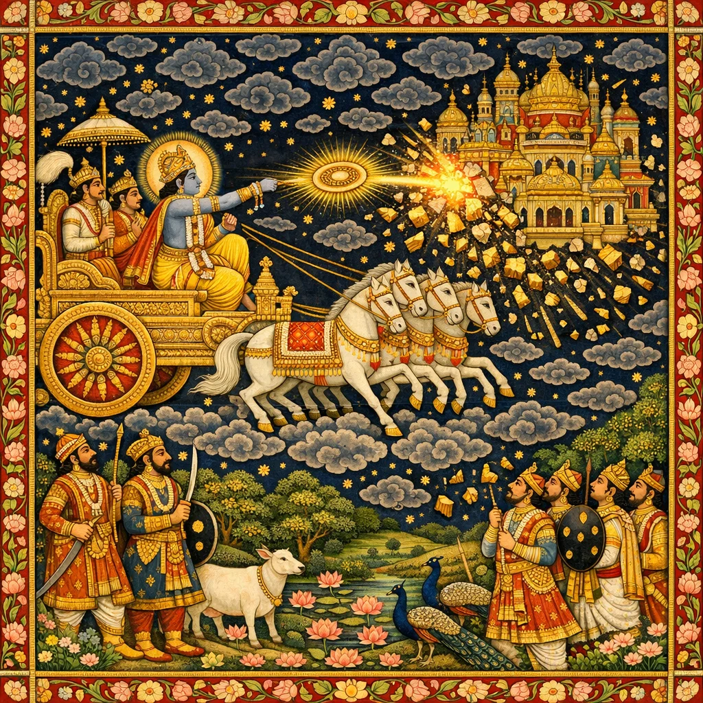 Sudarśana represents the Lord’s irresistible sovereignty that ends demoniac aggression and dissolves magical protections. The comparison to Indra beheading Vṛtra underscores a cosmic pattern: divine authority reestablishes order when adharma becomes violent and deceptive. Narratively, it concludes the Saubha terror and opens the next arc, as Dantavakra arrives seeking vengeance.