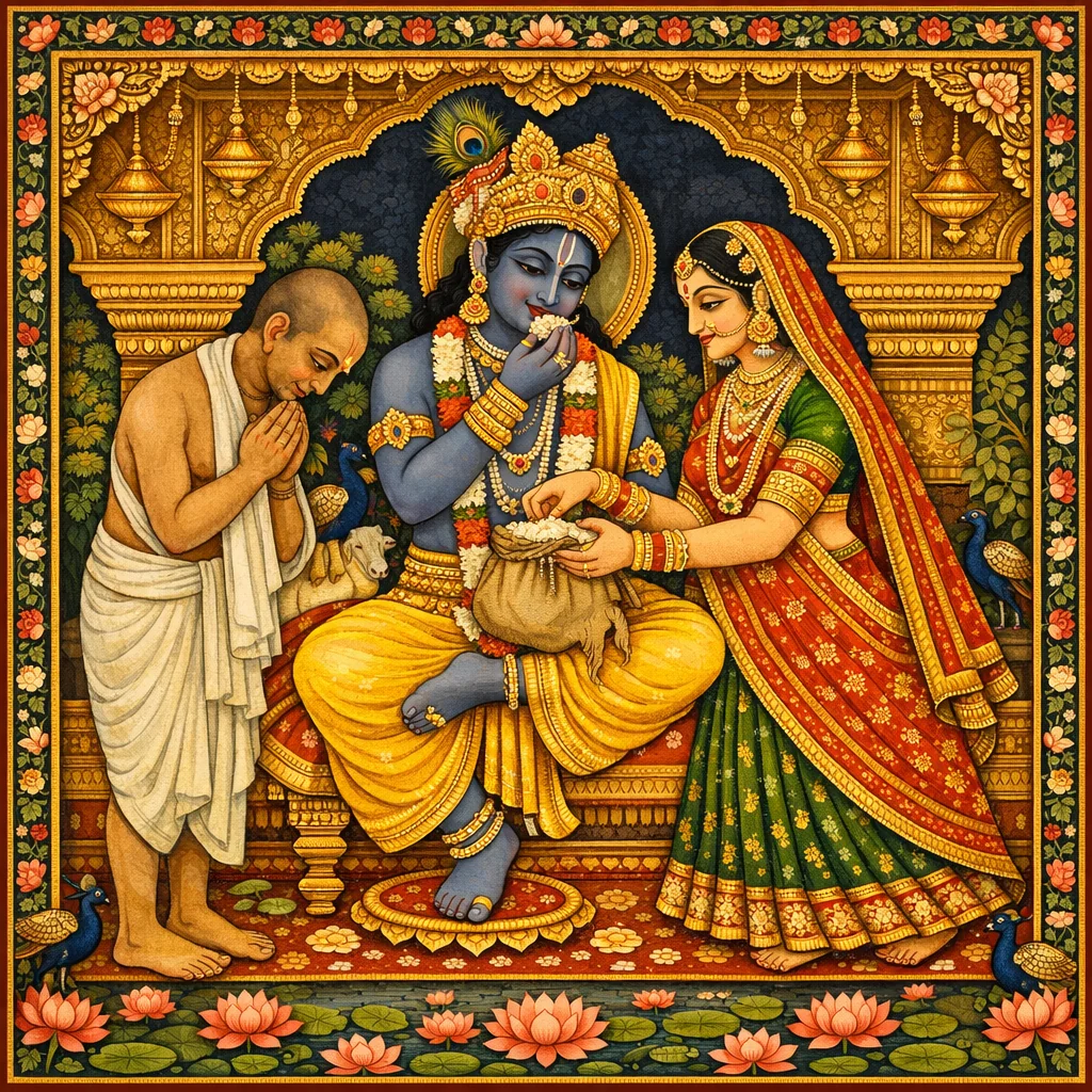 Sudāmā Brāhmaṇa Receives Kṛṣṇa’s Mercy (The Gift of Flat Rice)