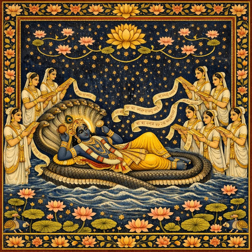 The personified Vedas (śrutis) represent revealed sound as conscious praise and conclusion (siddhānta). In the Janaloka narration, after cosmic nirodha the Lord remains with all potencies dormant; when creation is to begin again, the śrutis ‘awaken’ Him by stuti, illustrating that Vedic sound ultimately functions as glorification and invocation of the Supreme will—showing the Lord is independent, and creation proceeds when He glances upon māyā.