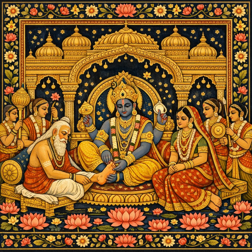 In Vaikuṇṭha the Supreme Lord lay with His head upon Śrī’s lap, and Bhṛgu struck His chest with his foot. The Bhagavān—supreme refuge of the saintly—rose at once with Lakṣmī in reverence. Descending from His bed, He bowed low before the sage and said, “Welcome, O brāhmaṇa. Please sit upon this seat and rest a while. Forgive us, dear master, for we did not notice your arrival.”
