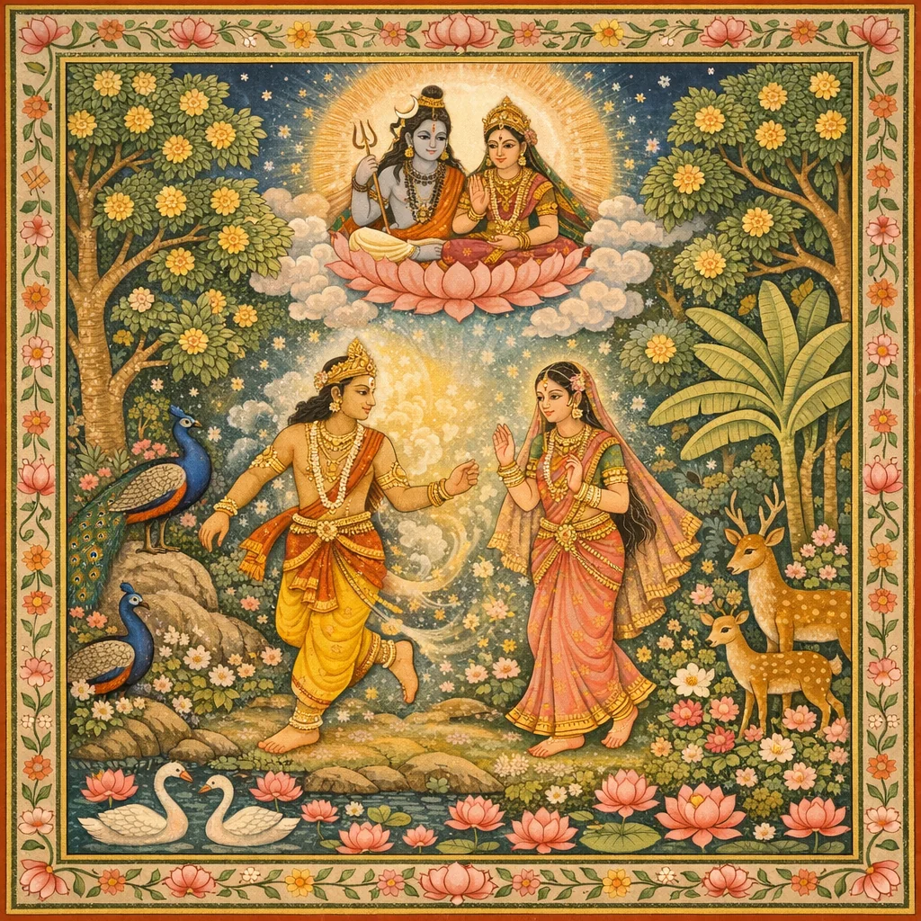 After Sudyumna’s transformation into a woman in Śiva’s forest, Budha (son of the Moon) desired union and accepted her as wife; from that union Purūravā was born. When Sudyumna later regained partial maleness via Śiva’s boon (alternating months), he eventually entrusted the kingdom to Purūravā—thereby creating a dynastic bridge from Manu’s line into the celebrated Lunar lineage that will be expanded in subsequent chapters.