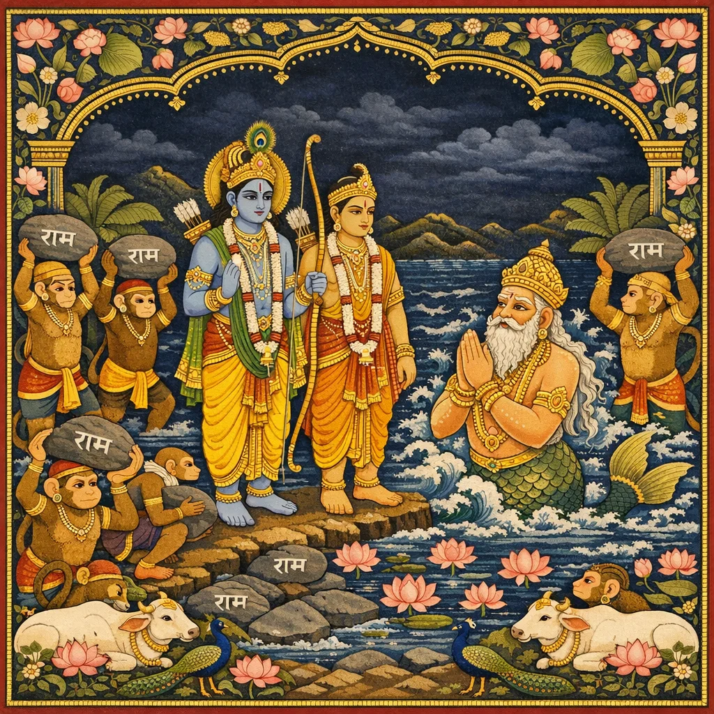 When the ocean did not appear, Rama exhibited anger. His glance terrified the marine creatures. Then the personified ocean fearfully approached with offerings, falling at Rama's feet to pray.