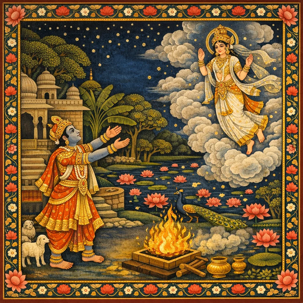 Their separation dramatizes kāma’s instability and the psychological consequences of attachment. Urvaśī’s instruction about women’s ‘fox-like’ heart is not presented as a blanket metaphysics of gender but as a narrative device urging sobriety: do not let senses devour the self. The episode functions as vaṁśānucarita—teaching rulers and listeners that uncontrolled desire leads to humiliation, grief, and wandering, whereas regulated conduct and higher pursuit can redirect life toward dharma.