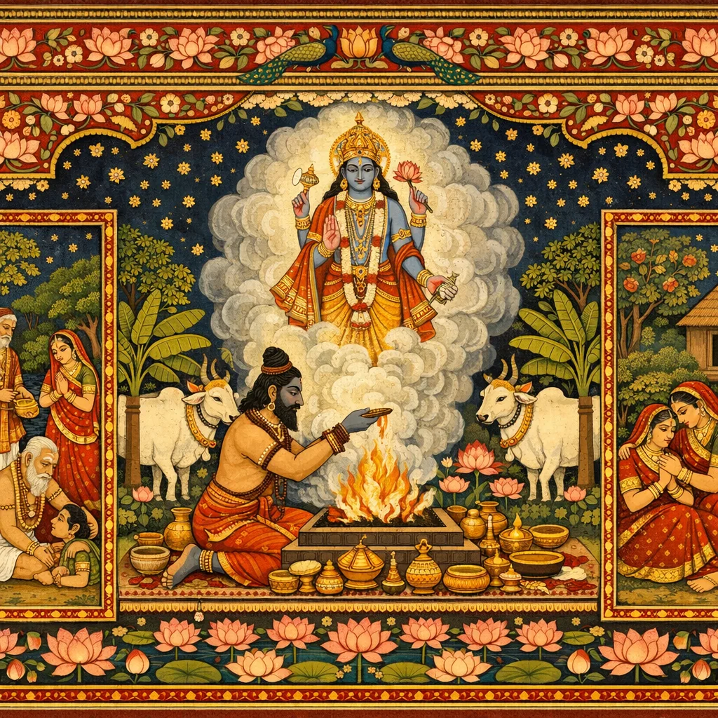 After retaliation, the narrative turns to restoration and purification: worship of Vāsudeva through sacrifice, avabhṛtha-snāna, and dāna to ṛtviks. The directional gifts dramatize total renunciation of sovereignty and conquest; Paraśurāma relinquishes the fruits of power and reorients the episode toward dharma—showing that even divine correction culminates in devotion, sacrifice, and detachment rather than permanent rule.