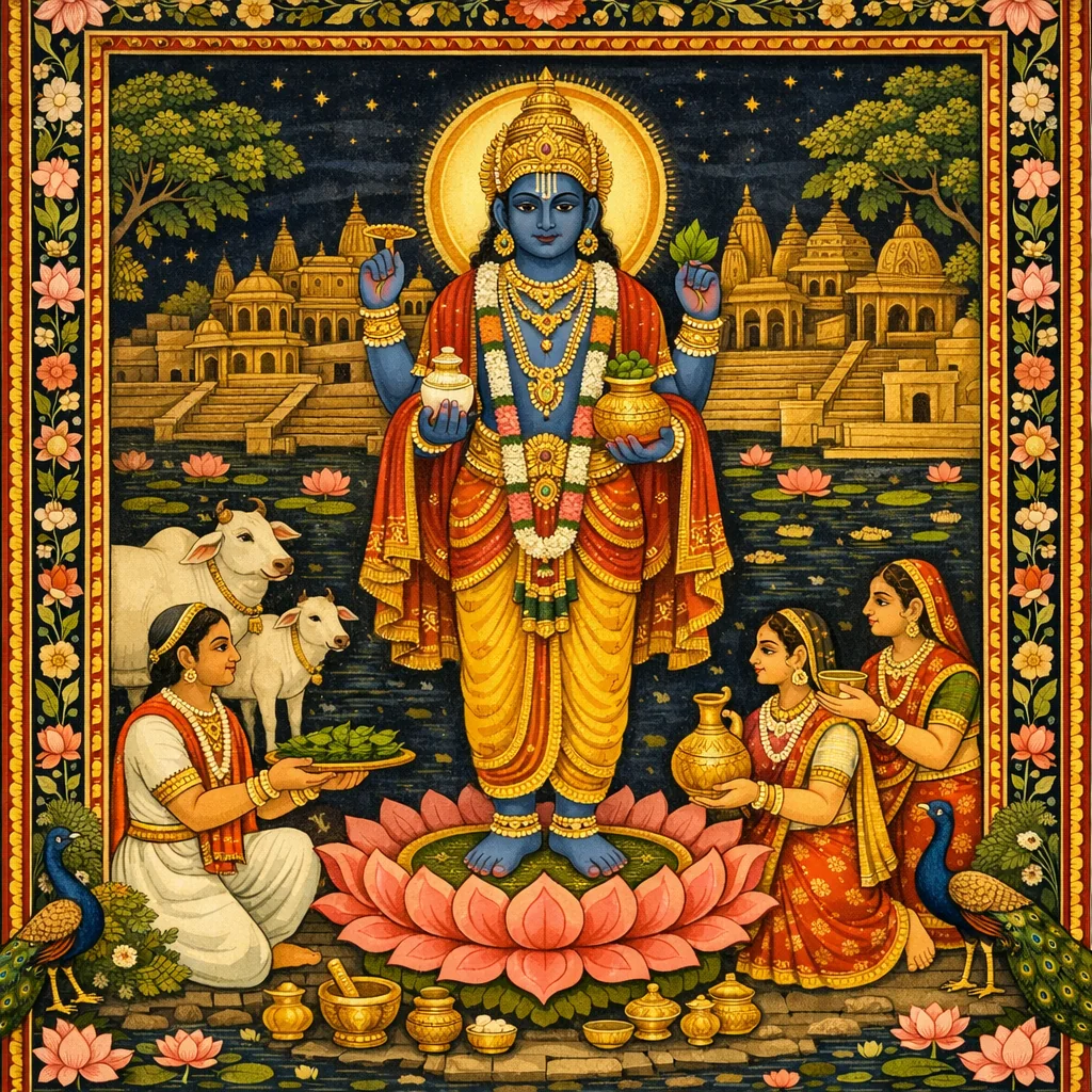 Dhanvantari is presented as a descendant in the Kāśi line (through Dīrghatama) and described as an incarnation of Lord Vāsudeva who inaugurates medical science (Āyurveda). The text praises remembrance of his name as a means to be freed from disease, linking healing to divine grace and sacred memory.