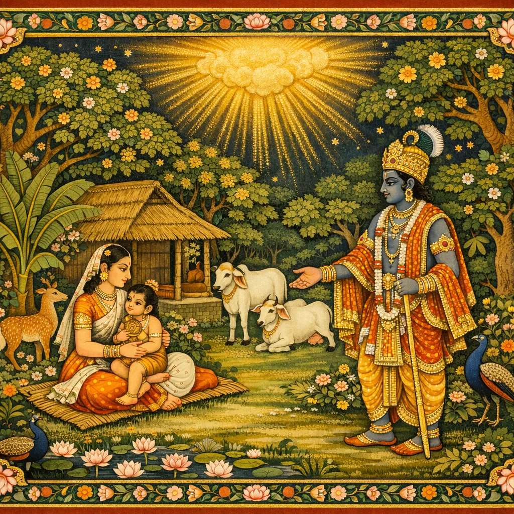 Though urged by the demigods to raise the child, Mamatā deemed him “Vitatha”—useless—because of his illicit birth and abandoned him. The Marut demigods then maintained him, and later, when Mahārāja Bharata lamented for want of a son, this child was given to him as his son.