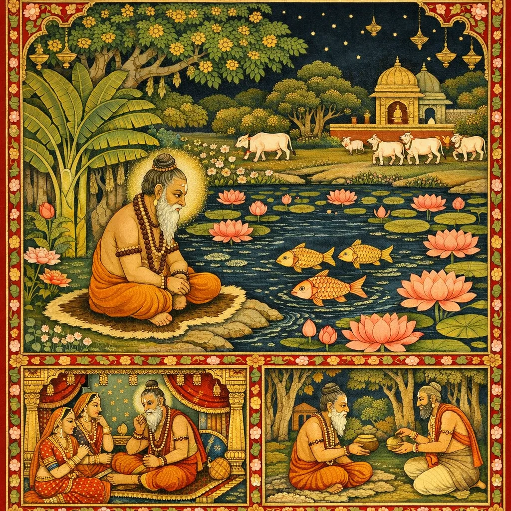 Saubhari’s austerity was disrupted by contemplating the mating of fish, which awakened latent desire. The Bhāgavata uses this to teach saṅga-doṣa: the mind internalizes what it repeatedly observes, and desire expands without satiation (illustrated by the ‘fire fed with ghee’ analogy). His later renunciation shows the corrective path—detachment, seclusion, and fixation on the Lord’s lotus feet with spiritually aligned association.