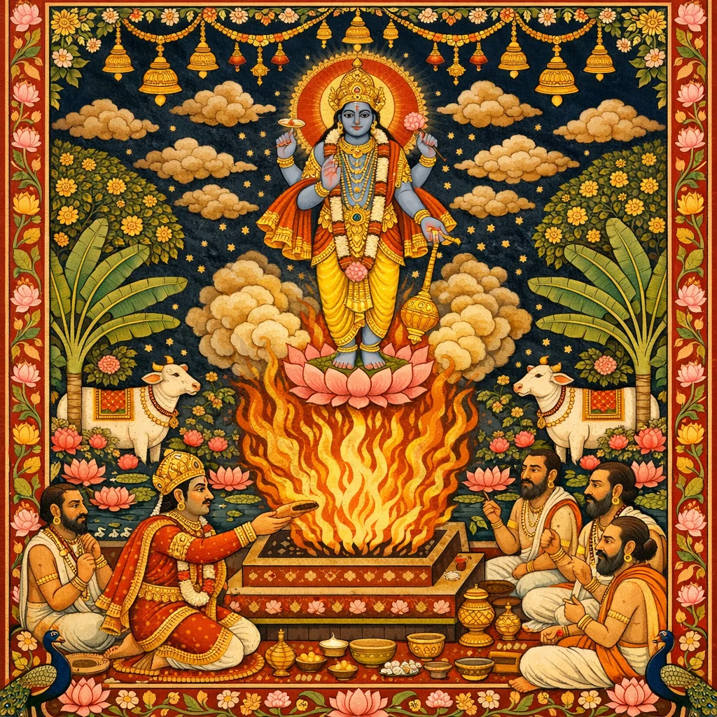 Mahārāja Gaya is a celebrated king in the Priyavrata dynasty described as situated in viśuddha-sattva, the Lord’s transcendental goodness associated with divine protection. He is called Mahāpuruṣa because his kingship and household life perfectly integrate welfare governance (poṣaṇa, prīṇana, upalālana, anuśāsana), Vedic sacrifice offered with devotion, humility toward devotees, and steady Brahman realization culminating in pure bhakti.
