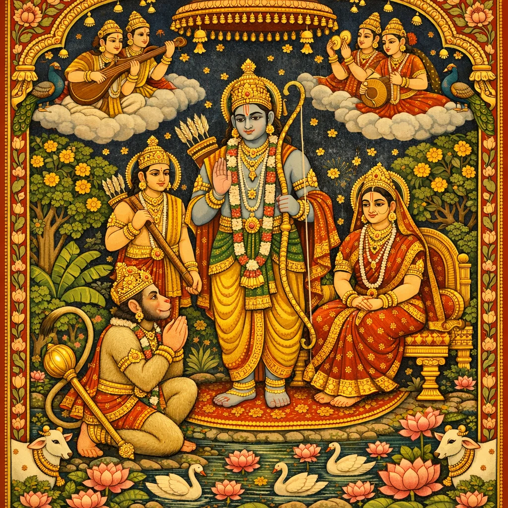 Hanumān’s prayer frames Rāma as Vāsudeva, the self-sufficient Supreme Lord, untouched by material attachment. The narrative presents His human-like tribulations as purposeful līlā—meant to teach mortals the dangers of material happiness centered on sex and possessiveness—rather than evidence of divine limitation.