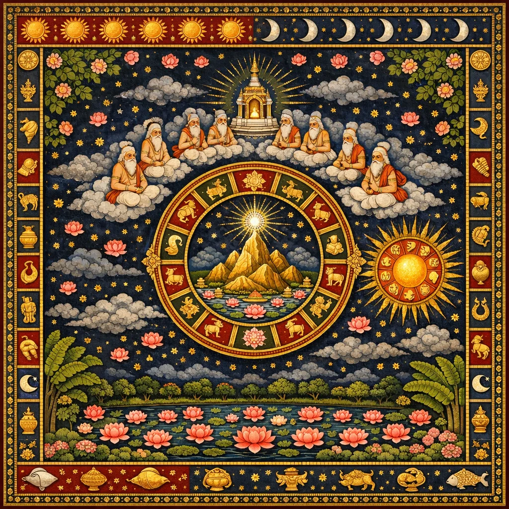 Continuing Skandha 5’s sacred survey of cosmic geography—after placing the regions around Sumeru and Dhruvaloka—Parīkṣit raises a logical doubt about the sun’s orientation: how can Sumeru and Dhruvaloka be said to lie both to the sun’s right and to its left? Śukadeva answers with the potter’s-wheel analogy, distinguishing the rotation of the zodiacal frame and the wheel of time (kāla-cakra) from the apparent motions of the “antlike” luminaries within it. The sun is then identified as an empowered manifestation of Nārāyaṇa, divided into twelve seasonal forms and twelve zodiacal names, establishing the year (saṁvatsara), months, fortnights, and ayanas. The narration ascends through the cosmic strata—moon, nakṣatras, Venus, Mercury, Mars, Jupiter, Saturn—describing their relative distances, characteristic movements, and auspicious or inauspicious effects, especially regarding rainfall and social well-being. It culminates with the Seven Sages (Saptarṣi-maṇḍala) circumambulating Dhruvaloka, preparing for further teachings on higher planetary arrangements and divine governance of time.