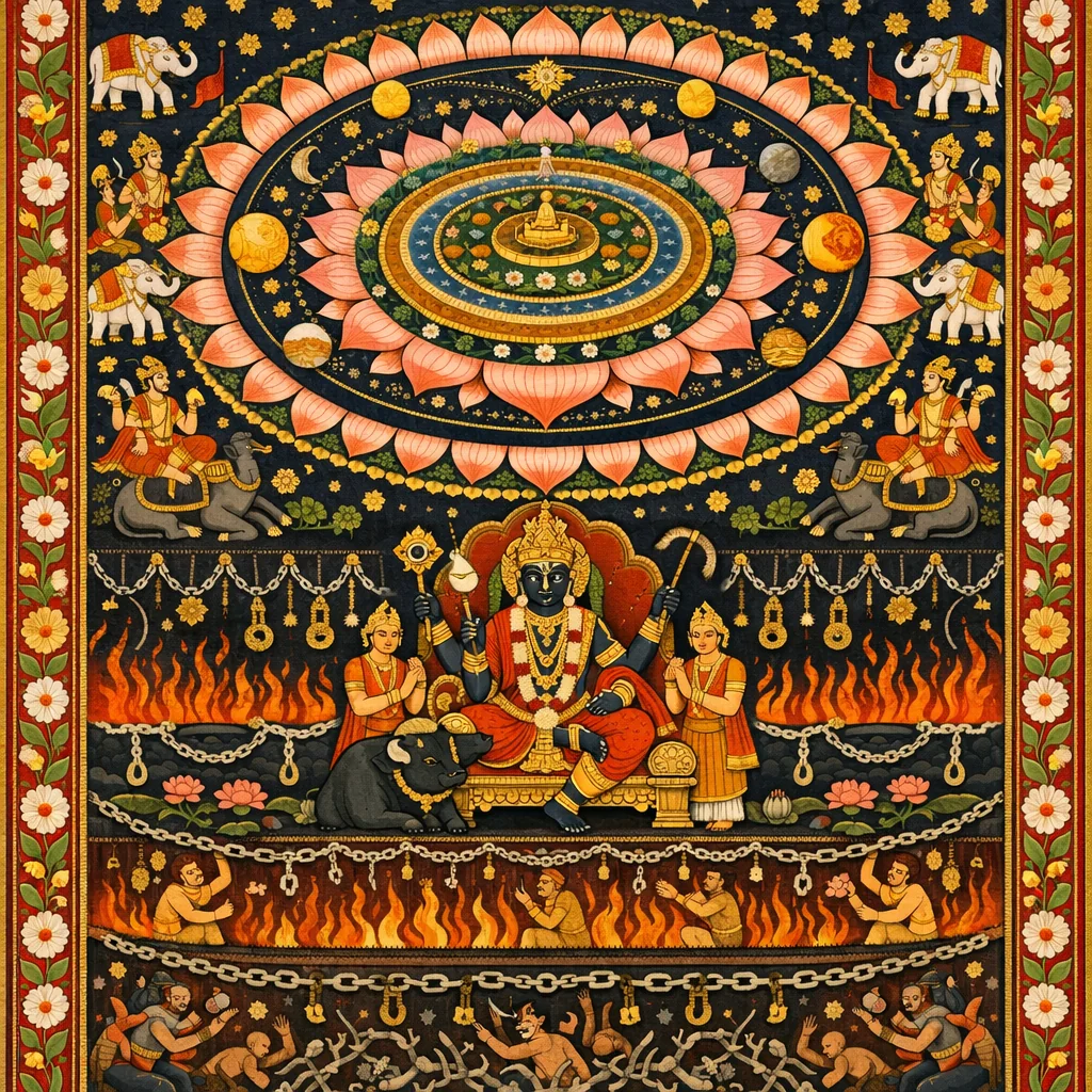 Bhāgavatam 5.26 places Naraka regions in the intermediate space between the three worlds and the Garbhodaka Ocean, on the southern side of the universe, beneath Bhū-maṇḍala and slightly above the Garbhodaka waters. Pitṛloka is also in this region, and Yamarāja resides there to administer karmic justice through his agents.