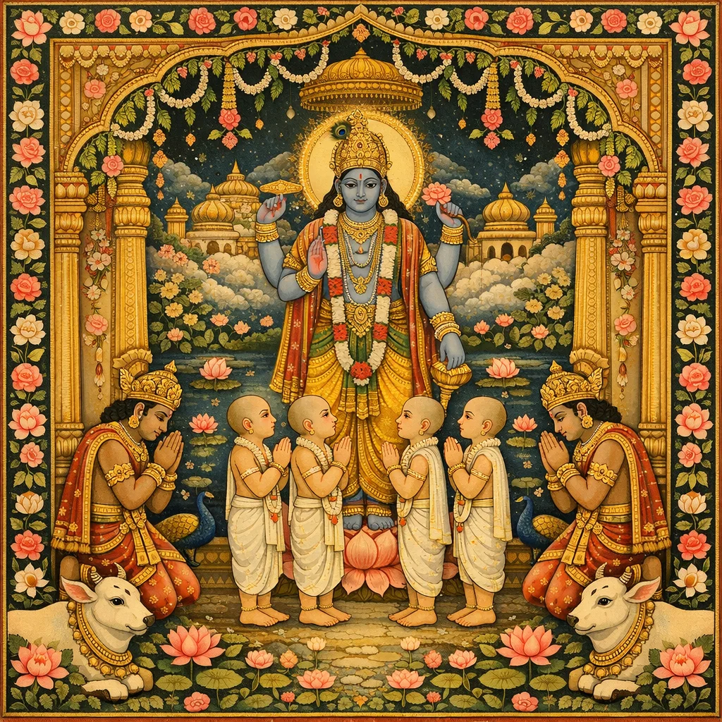 At Vaikuṇṭha’s gate, after the Four Kumāras curse the doorkeepers Jaya and Vijaya, Brahmā and the Supreme Lord appear to settle the crisis. The Lord accepts responsibility for His servants’ offense and seeks forgiveness, declaring brāhmaṇas, cows, and the defenseless to be integral to His own body. Revealing His bhakta-vātsalya, He values offerings to saintly brāhmaṇas above ritual oblations and honors the dust of Vaiṣṇava feet. The sages, first angered, are softened by His Vedic-like words yet cannot grasp His deeper purpose; they praise Him as the source and protector of dharma and submit to whatever outcome He ordains. The Lord explains the curse was sanctioned by Him: Jaya and Vijaya will take demoniac births but return swiftly through intense, anger-driven absorption in Him. As they leave Vaikuṇṭha, the demigods lament and Lakṣmī’s earlier foretelling is recalled. The narrative turns toward their incarnation in Diti’s womb as cosmic antagonists, setting the stage for coming divine interventions and the restoration of balance.