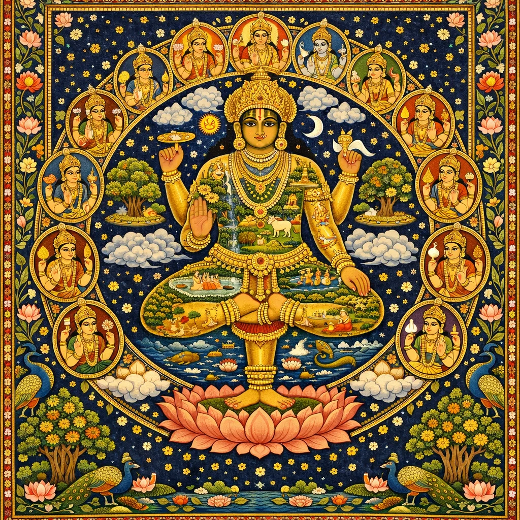 The virāṭ-puruṣa is a pedagogical manifestation that helps conditioned beings understand the Lord’s immanence in the cosmos. It organizes the universe into a comprehensible sacred anatomy, leading the mind from gross cosmology toward the recognition of the Lord as the inner controller (Paramātmā) and ultimately toward bhakti, where one relates to Bhagavān beyond the material frame.