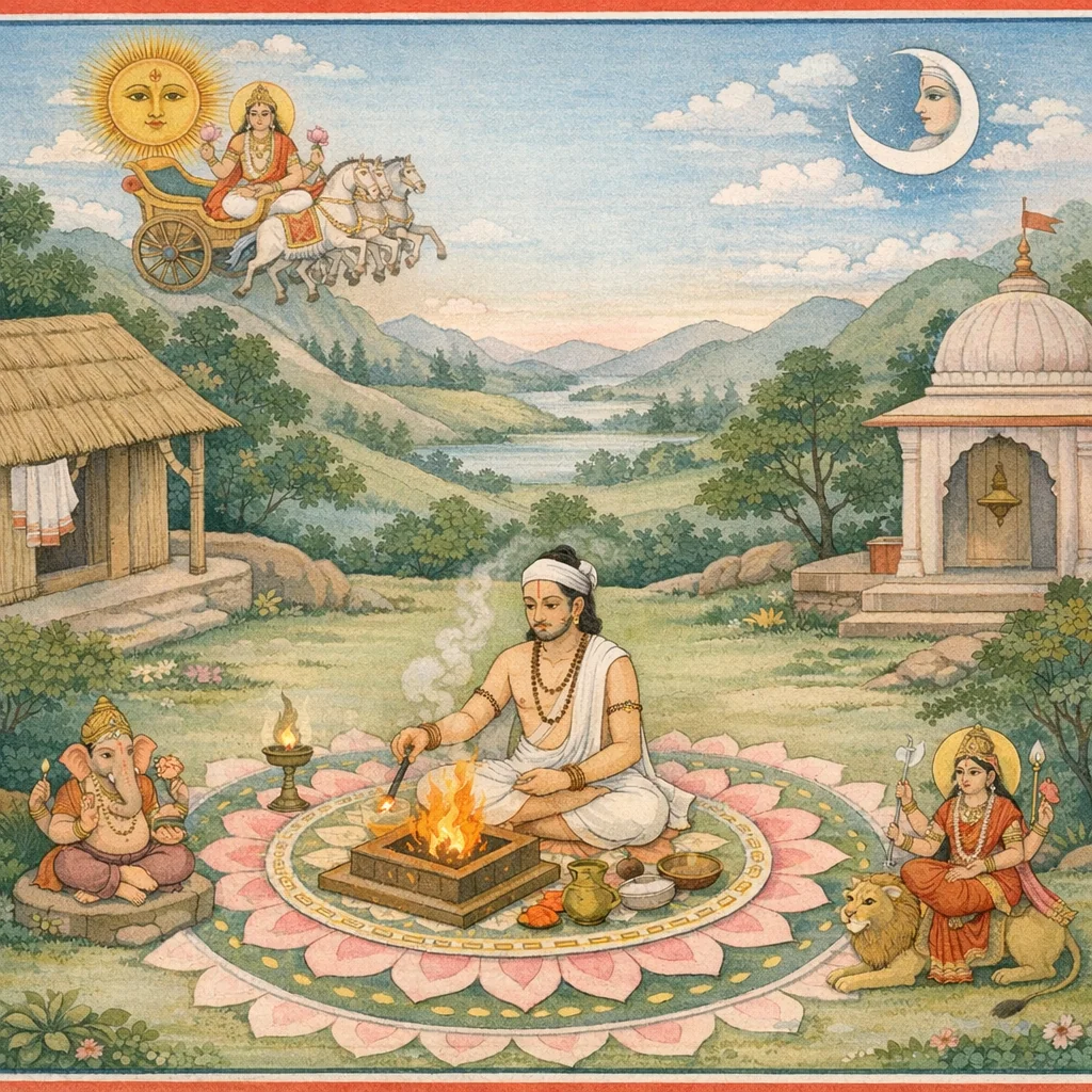 They signal that the ritual space is a microcosm: elemental order (ākāśa and others), temporal regulators (Sun/Moon), and Vedic vibration collectively ‘animate’ the maṇḍala so worship aligns personal intention with cosmic rhythm.
